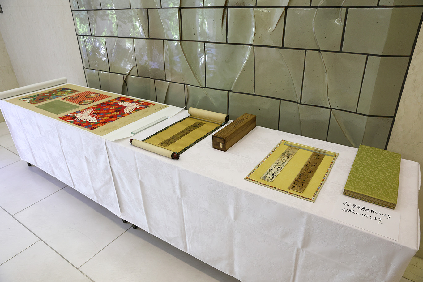 ご登壇いただきましたのは、泉屋博古館学芸部長実方葉子様、衣紋道山科流若宗家山科家30代後嗣山科言親様、京都文化博物館主任学芸員西山剛様、元離宮二条城事務所学芸員松本直子様です。会場にシンポジウムのテーマである「二条城寛永行幸図屏風」の複製を泉屋博古館様のご協力で展示させていただきました。屏風からあふれ出る寛永行幸の華やぎと熱気を感じつつ繰り広げられるさまざまな専門的見地からのお話に、ご来場者の皆さんも熱心に耳を傾けておられました。さらにロビーには、山科言親様が寛永行幸ゆかりの品々を展示くださいました。来場者の方々も寛永行幸をよりリアルに感じていただけたようです。山科様、ありがとうございました。